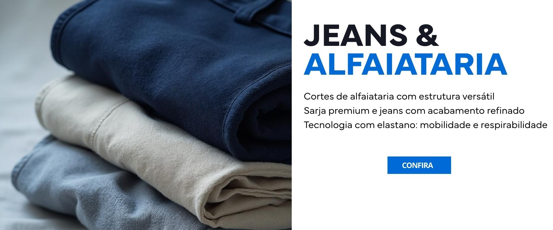 Denim premium de toque macio e leve stretch que contorna a silhueta com firmeza e preserva cor e estrutura.