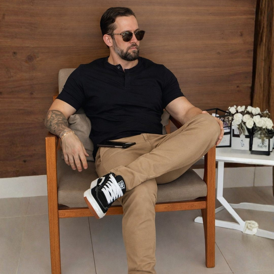 Combina com camisa, polo ou Henley — sempre com presença e naturalidade.